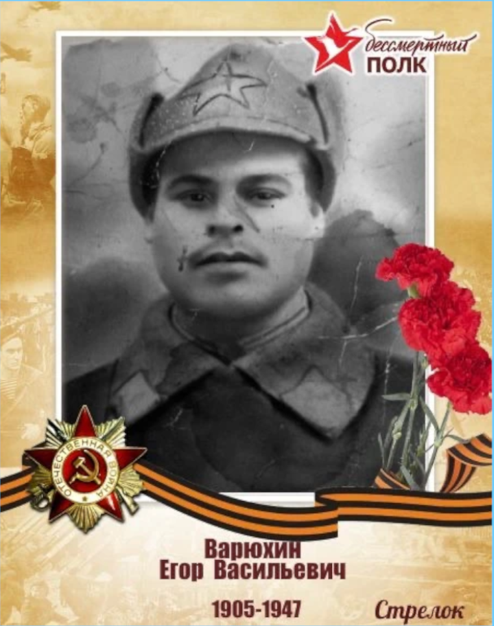 Варюхин Егор Васильевич 1905 г.р Красноармеец. Стрелок 110 стрелкового полка Западного фронта. В боях при наступлении на Безымянную высоту около д. Мамона Воронежской области 23.01.1943 был тяжело ранен осколком мины. Награждён медалью "ЗА БОЕВЫЕ ЗАСЛУГИ", медалью "ЗА ОТВАГУ".